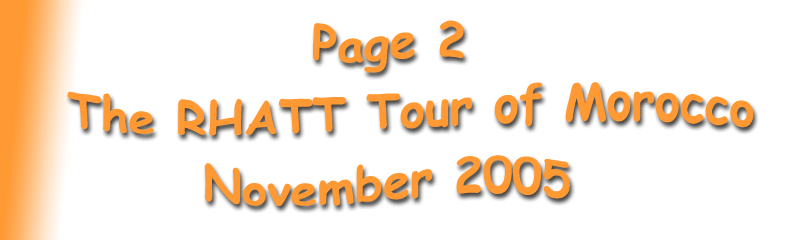 Wednesday, 23 Nov 2005: The owners of the Ryad Tinmel are French and the continental breakfast was a good indicator of their origin…only bread and jam; even the orange juice was a mix of 50% fresh and 50% tang. We met our guide for the day…Mubarak. He made a nice first impression and we began our tour of the medina. We soon realized that his English skills were not good enough to explain what we were seeing. He kept saying we should walk on the left side of the street while pushing us to the right. He couldn’t provide and history or stats about the city, nor any of the cultural aspects of the medina. We did learn that anything hand made by Berbers was good and any construction by machine of a tribe other than Berber was bad. We quickly realized that we had made a bad decision to accept Fatah’s recommendation for a guide especially when he refused our request to visit the museum. We did see the tiny shops with men and boys making clothes, shoes, blacksmith tools, wrought iron doors and gates, wooden furniture and windows. We constantly had to dodge donkey carts, bicycles and mopeds. We eventually arrived at a rug shop where we were introduced to Omar. For the next 1 ½ hours we were entertained by one of the most theatrical salesman ever. His shop was a cooperative with an enormous selection from over 800 native weavers. He explained the major regions for Moroccan carpets: the middle Atlas, the high Atlas and the Berber Bedouin while displaying examples of each. These carpets were unique to any tribals we had collected and we particularly appreciated the colors and designs of the Berber Bedouin. After a very animated bargaining session, we agreed on a price for four pieces and had them packaged for shipment to Steve’s office in N.Y. Omar’s eloquence and style convinced us that we should dismiss our guide and continue on our own. We asked Mubarak to take us back to our Ryad where we explained that we no longer required his services. We made plans to continue our self directed explorations and took a taxi to the main square: Jemaa El Fna. After a quick cursory tour of the square to find our restaurant for the evening, we stopped at a terrace imbiss for some ice cream. We then walked back through the vendor carts and snake charmers to visit the Kasbah, which contains the Saadian Tombs, and the ruins of the Palace Bahii., this time we were under the direction of guide Robin and her Marrakech guide book. We ambled back to the Jemaa El Fna stopping along the way to try a phone card and visit an internet café. We arrived at the restaurant about ½ hour before it opened for the evening, but they allowed us to take a table and enjoy a beer until the official opening time. The meal was OK but not memorable. As we started our walk back across the square to find a cab, we were startled at the transformation; hundreds of small outdoor eateries had sprung up and the air was filled with smoke form the charcoal burners. Street musicians, fortune tellers and games of chance seemed to cover every square meter of the square. The activity really needs to be experienced to be appreciated.