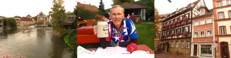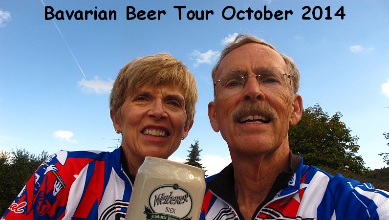 and knee socks so that I’ll be in style for the next Fredericksburg Oktoberfest. From there we visited a brewery famous for Rauch Bier and then returned to the hotel and changed into biking clothes. Our first stop was only 8 kilometers away, fortunately the bike paths were very easy to follow and kept us off the busy traffic streets. We found a brewery in Lohndorf named Reh – Braurei. We met one of the owners who poured his signature Pils for us. It was very pleasant. We visit a short time while I asked all my questions about his brewery, but they were more interested in our tandem bike and our trip. We then pedaled on to Memmelsdorf to the Drei Kronen Braurei where we sampled two of their beers…a Pils and an Alt style. Now it was time to return to Bamberg and prepare for the evening. Our bike tour was just a little of 18 miles and we passed more than 12 breweries…this is really a great tourist venue! We had planned to have dinner at one of the breweries we had visited earlier in the day, but that was also the plan of so many other tourist that we could not even get to the front door. Not a problem…there are many other fine restaurants around and we quickly found a suitable substitute where we enjoyed very typical Bavarian fare…Sauerbraten for Becky and Sweinerhaxe for Hugh and of course plenty of the local brew. Finally it was time to return to the hotel and continue the jet lag recovery.