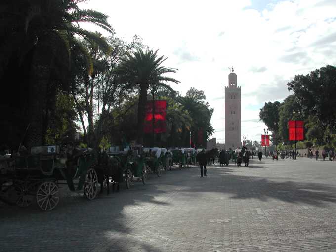 Horse drawn carraiges lined up for the tourist at Jamaa L Fna