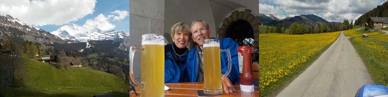 We had a wonderful breakfast at the HUUS hotel before we collected our tandem from the hotel bike shop and departed for the scheduled route. The route took us through a tour of Gstaad just in case we really wanted to see a tourist village full of multi millionaires. OK, it was nice, but we believe Fredericksburg is just as appealing. From Gstaad we climbed over the mountain pass, seeing gorgeous high meadows with cows grazing and ringing their bells. The first third of the days was through some truly wonderfully scenic areas of Switzerland, but it soon crashed as we encountered some seemingly endless gravel trails. Our progress slowed to a crawl as we struggled to keep the bike moving forward through the sloppy paths. Eventually we said enough of this crap and decided to chart our own route with the help of the Garmin and Google maps. We got back onto the road we should have never left and soon ended up on a good route into Interlaken without any more gravel paths. Thanks to the internet we could find options which were better for us. The ride for Spietz to Interlaken was almost all downhill so the bad memories of the lousy gravel paths soon faded. We found the Carlton Hotel where we had arrangements to store our bike for the next 2 days. We found the train station and caught the next train to Lauterbrunen and connection to Wengen. We found the Falken Hotel which would be our address for the next 2 nights. After checking in, we walked to a local tavern for a beer and then to the Eiger Restaurant for dinner. If you ever saw the movie “The Eiger Sanction” that’s where we are. So now it’s time to shut down for the evening and relax. Today we rode 50 miles with 2600 feet of climbing.